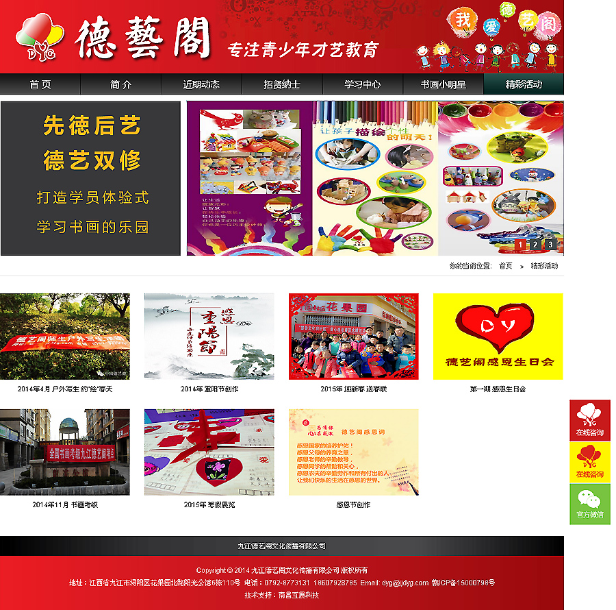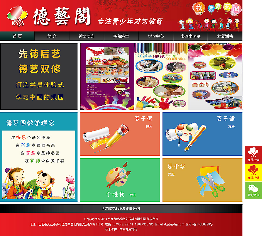 德艺阁青少年才艺教育中心隶属于九江德艺阁文化传播有限公司,成立于2014年3月1日,是一个拥有专业师资团队,自主品牌的连锁教育机构;以专注少儿书画教育、尽心帮助孩子用书画去表达感恩为教育宗旨,结合传统国学教育教学,旨在推动传统文化的发展、打造学生体验式学习书画的乐园。