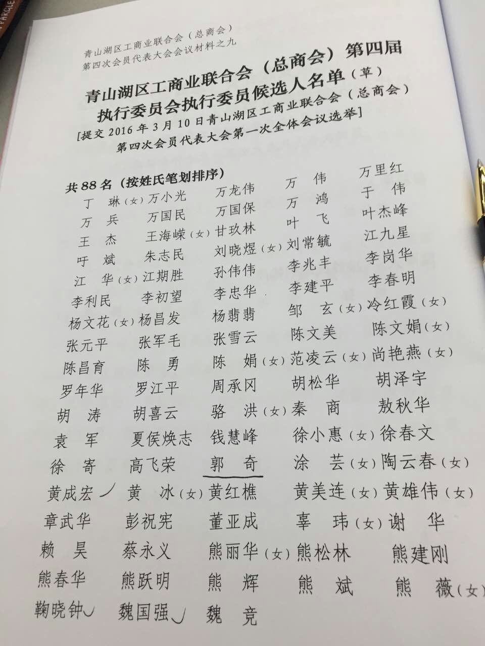 3月10日上午9点在青山湖区政府一楼会议室,青山湖区商业联合会(总商会)第四次会员代表大会隆重召开。出席的省领导有省委统战副部长、省工商联党组书记李青华、省工商联党组成员、秘书长叶元斌,市工商联主席熊志刚,青山湖区委书记陈匡辉、青山湖区区长熊运浪等领导。经过公平、公开、公正选举大会一致投票,工商董事长郭奇先生全票通过,当选青山湖区工商联执委委员,已连续两届荣誉当选,